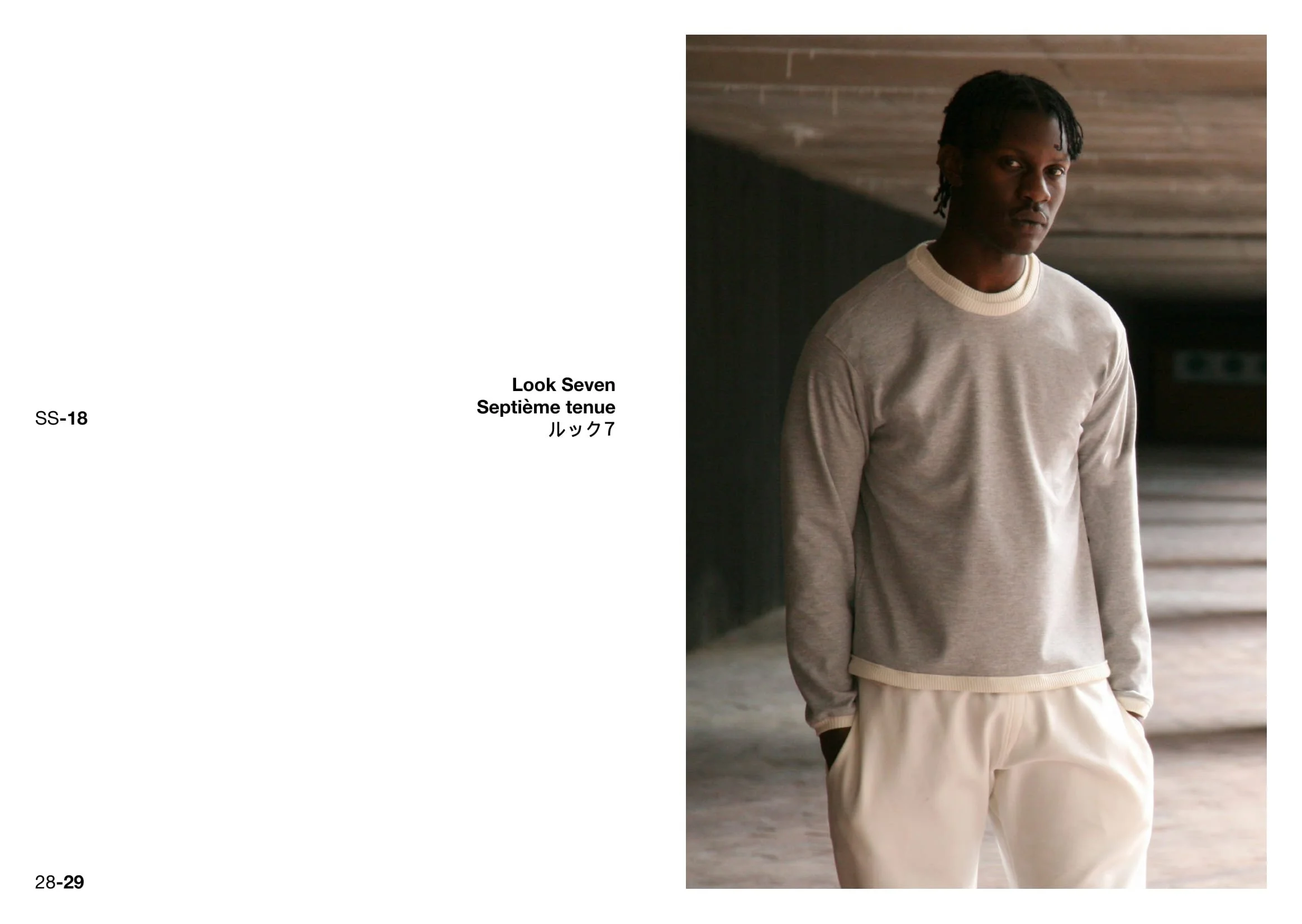 A man wearing a light gray jacket with vertical stitching details and white pants standing against a gray textured background.