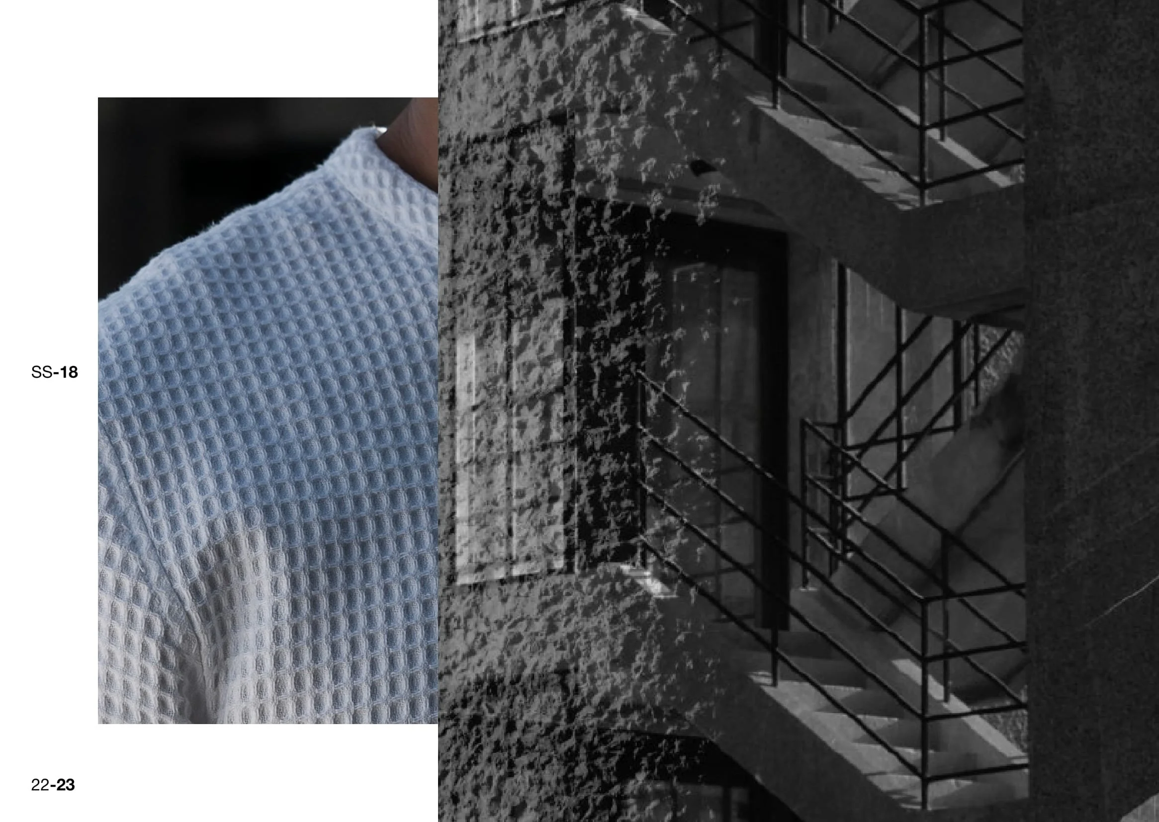 Close-up of a person's shoulder wearing a white textured fabric garment, with a black-and-white architectural photo of a building and staircase in the background.